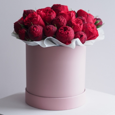 Эта замечательная шляпная коробка с красными пионовидными кустовыми розами обязательно поднимет настроение получателю!